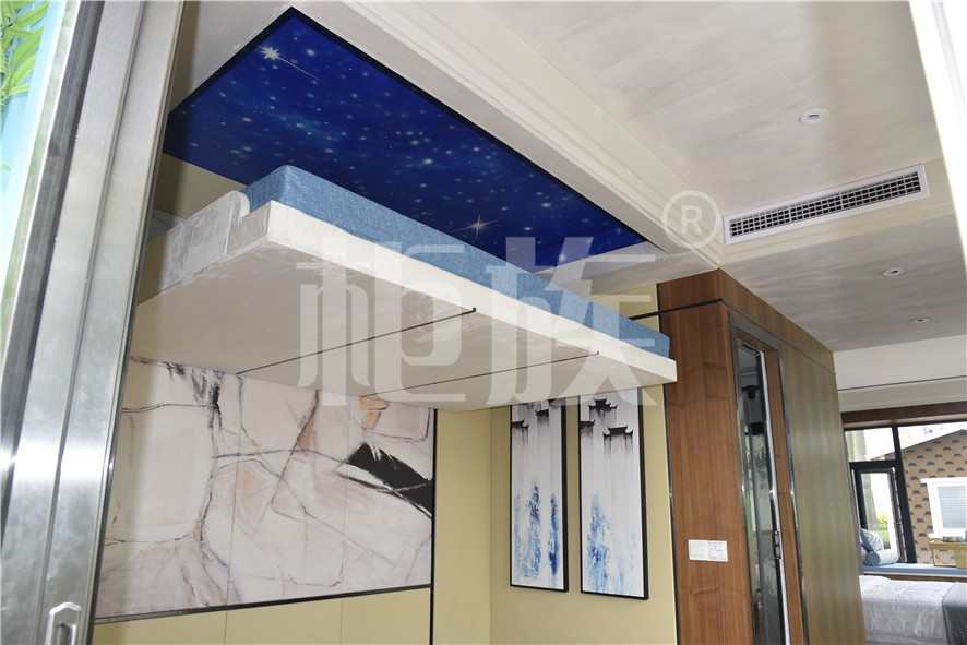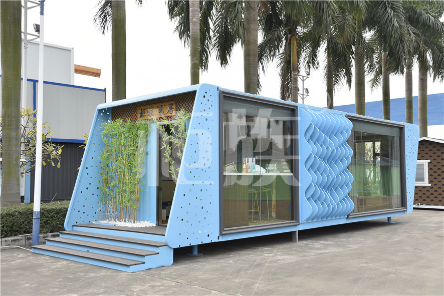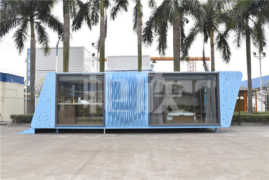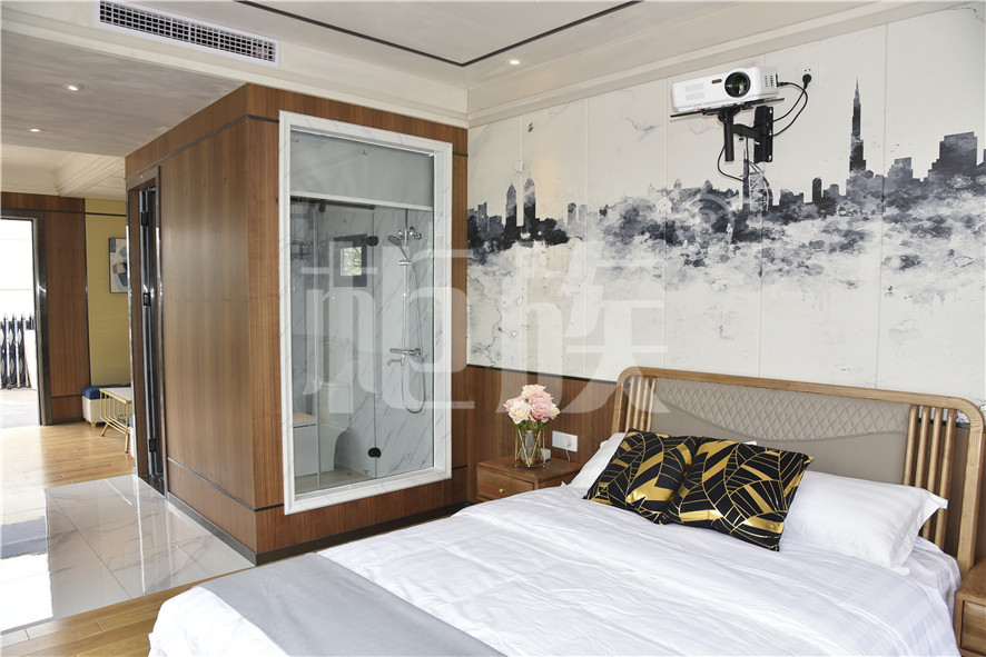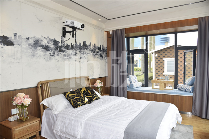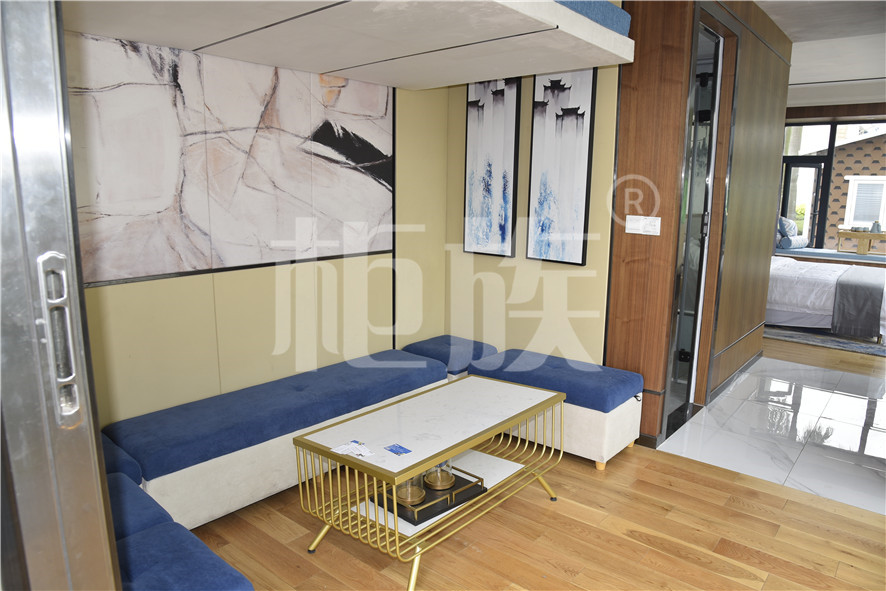 Functional layout: Step into the house, the house is raised as a whole. The front hall is equipped with a bar and a coffee table. The floor is a hidden elevating bed. In the middle is a wardrobe, vanity and bathroom. The bedroom has bay window balcony and video system. The large floor glass is suitable for viewing. It can be used as a special homestay in scenic area.